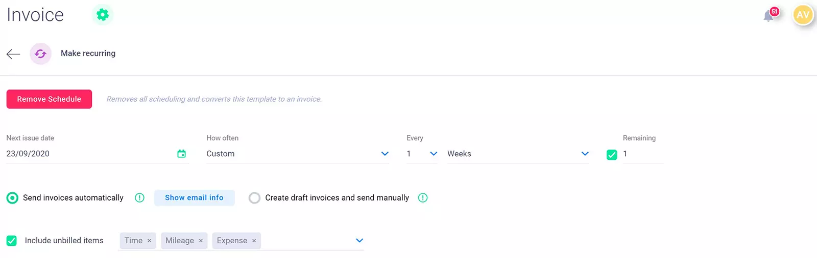 - Remaining: This is how many invoices you want to send. If you were sending one invoice a month for the year you would set this to 12. This value will count down as your invoices are sent.